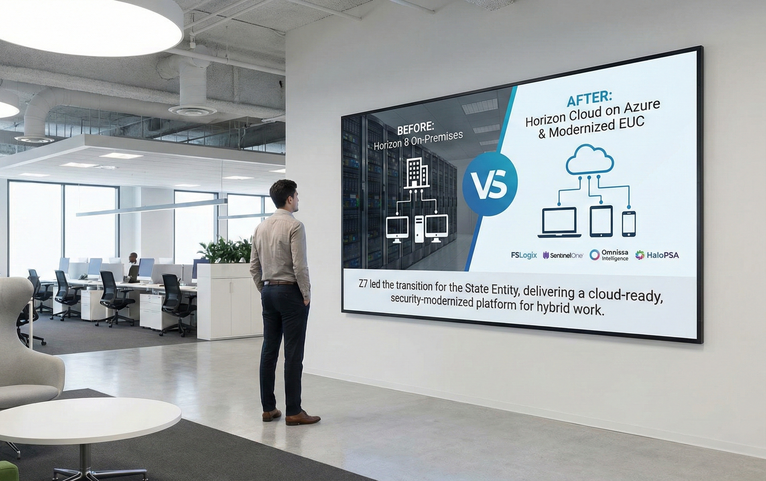 Z7 was asked to fix the environment, retire Citrix, standardize Horizon 8 across both sites, and keep production VDI on premises, using cloud only for backup and recovery.